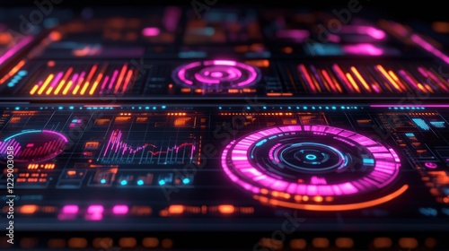 © ROY, Obraz premium Futuristic digital interface with glowing graphs and charts.
