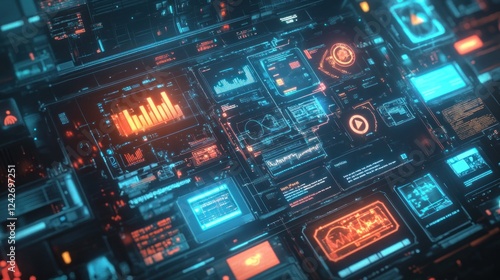 © BerkahStock, Obraz premium Futuristic digital interface with glowing graphs, charts, and data streams.