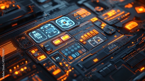 Obraz premium Futuristic digital interface with glowing orange and blue elements. (1)