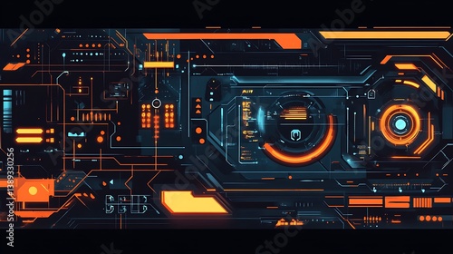 Obraz premium Futuristic digital interface with glowing orange and blue elements. (1)