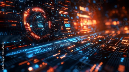 Fototapeta premium Futuristic digital interface with glowing orange and blue lines.