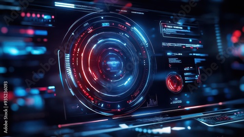Fototapeta premium Futuristic digital interface with glowing red and blue circles, lines, and data.