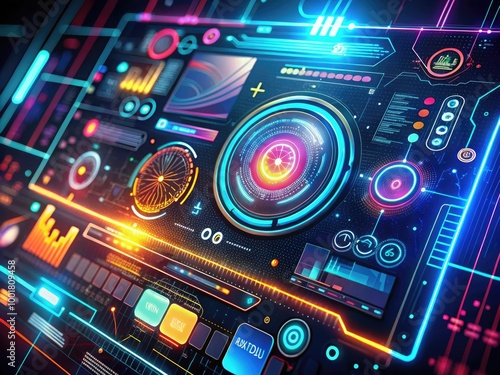© Supittra, Fototapeta premium Futuristic digital interface with glowing text and abstract shapes on a dark background