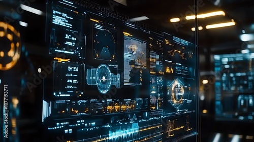 © Indri, Obraz premium Futuristic digital interface with graphical data and code displayed on multiple screens