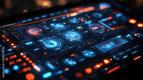 Obraz premium Futuristic Digital Interface with High-Tech Elements and Neon Colors Displaying Complex Data Metrics on a Touchscreen Device at Night