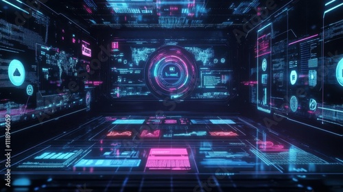 Obraz premium Futuristic digital interface with holographic data displays.