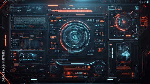 Obraz premium Futuristic digital interface with HUD elements, graphs, and data visualizations.