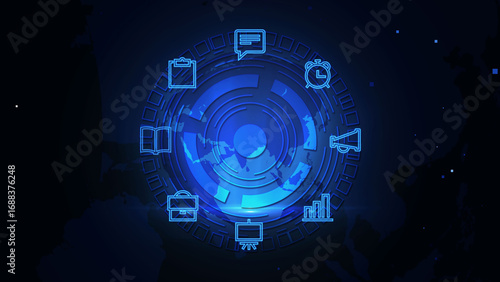 Obraz premium Futuristic Digital Interface with Various Technology Icons in Blue