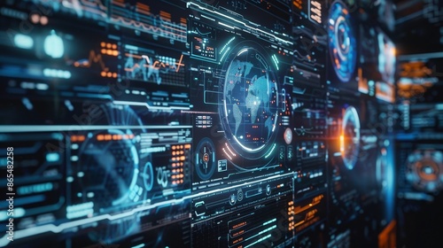Fototapeta premium Futuristic Digital Interface with World Map - A digital interface with various displays and a prominent world map at the center. The display has glowing orange and blue lights