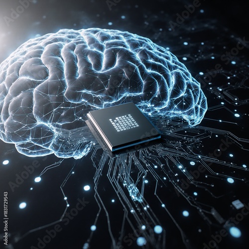 © Pixel Matrix, Obraz premium Futuristic digital landscape depicting brain-inspired AI microchip technology