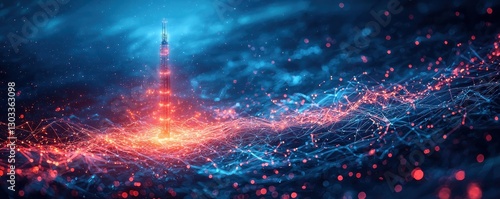 © Georgii, Naklejka premium Futuristic digital landscape featuring glowing blue networks and radiant signal tower