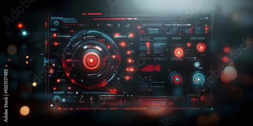 Obraz premium Futuristic digital landscape showcasing an immersive user interface with intricate HUD and GUI elements Featuring a vibrant color palette neon highlights dramatic chiaroscuro lighting