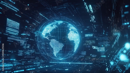 Fototapeta premium Futuristic digital landscape with a holographic representation of Earth...