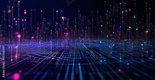 © 为轩 张, Fototapeta premium Futuristic Digital Landscape with Data Lines, Dots, and Network Grid in Cyberpunk Style