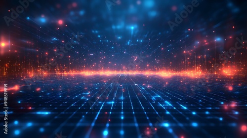 Obraz premium Futuristic digital landscape with glowing grid and light particles, ideal for...