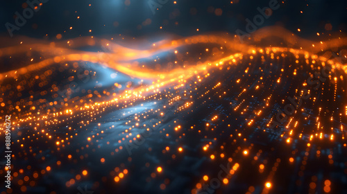 © Kakabe, Fototapeta premium Futuristic digital landscape with glowing orange particles and wave patterns on a dark background. Abstract technology concept.