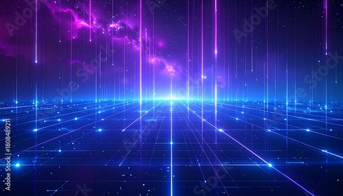 © Raf, Obraz premium Futuristic digital landscape with gridlines converging towards a bright point, bathed in violet and blue light