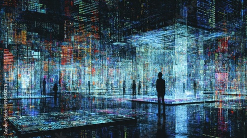 © Yulia, Fototapeta premium Futuristic Digital Landscape with Silhouettes in Cyberpunk Cityscape