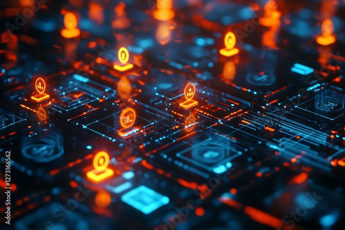 © Sipon Ray, Fototapeta premium Futuristic digital network, user profiles grid, glowing blue and orange nodes, data visualization, interconnected system, cybersecurity concept, abstract technology background