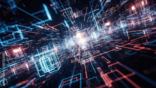 © Hala, Obraz premium Futuristic digital network with glowing neon lines and geometric shapes, representing technology, data transfer, and innovation in a dark abstract setting