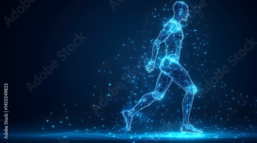 Fototapeta premium Futuristic digital runner, energy pulsing through a network of light. Dynamic, motion-filled scene. Abstract Digital low-poly wireframe connected dots in dark blue.