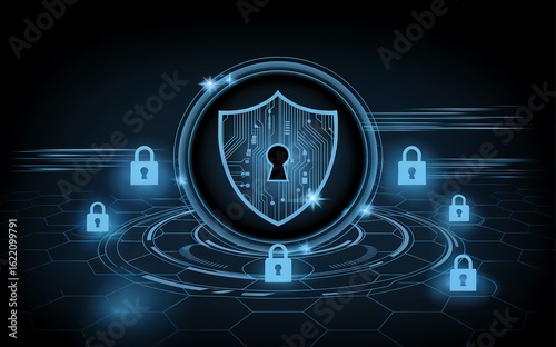 Obraz premium Futuristic digital shield icon representing cyber security, data protection, and secure network systems.