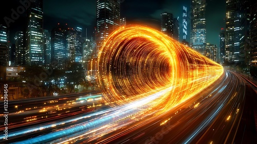 © MindVerse, Obraz premium Futuristic Digital Speed Trail Light Effect in Cityscape Background