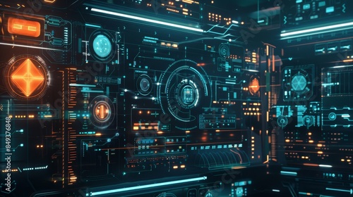 Obraz premium Futuristic digital technology interface with holographic elements, vibrant...