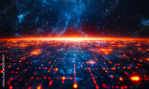 © Bartek, Fototapeta premium Futuristic Digital Technology Landscape with Glowing Circuit Pattern Beneath Starry Sky Illustrating Space and Innovation