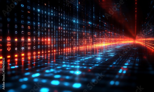 © Dion, Fototapeta premium Futuristic digital tunnel with glowing binary code.