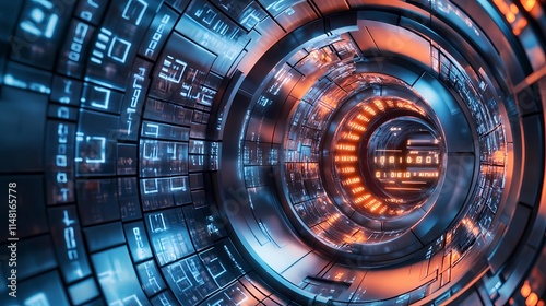 Obraz premium Futuristic Digital Tunnel with Glowing Binary Code and Neon Lights Reflecting in a Sleek Metallic Environment, Evoking a Sense of Virtual Reality Journey Space Exploration