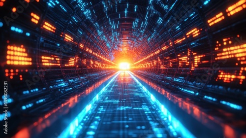 Fototapeta premium Futuristic digital tunnel with glowing blue and orange LED lights converging...