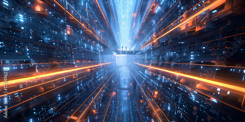 Naklejka premium Futuristic Digital Tunnel with Glowing Blue and Orange Lights