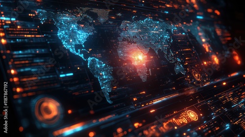 © delvin std, Obraz premium Futuristic digital world map with glowing elements.