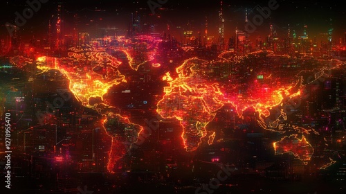Naklejka premium Futuristic Digital World Map with Glowing Network Connections and Cityscape...
