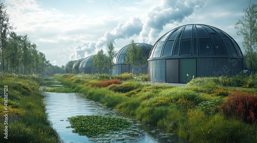 Obraz premium Futuristic Domes by the Canal: A Serene Eco-Village