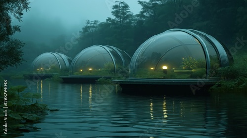 Obraz premium Futuristic Domes on a Misty River at Twilight. Keywords dome, futuristic,...