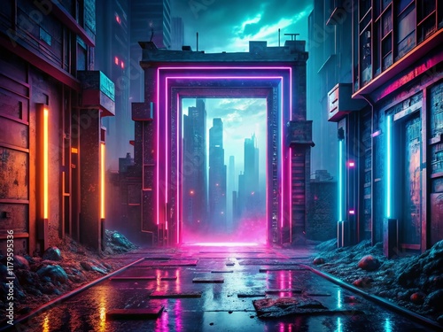 Obraz premium Futuristic Doorway: Cyberpunk Cityscape, Neon Lights, Pixel Art, Quantum Gateway