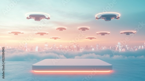 Fototapeta premium Futuristic drones above a cityscape at sunset.