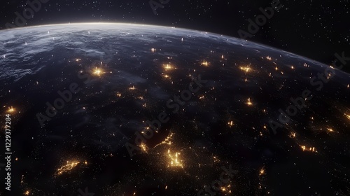 © TINGTING, Fototapeta premium Futuristic Earth-centered network with glowing crypto nodes and IoT connections, symbolizing global digital connectivity.