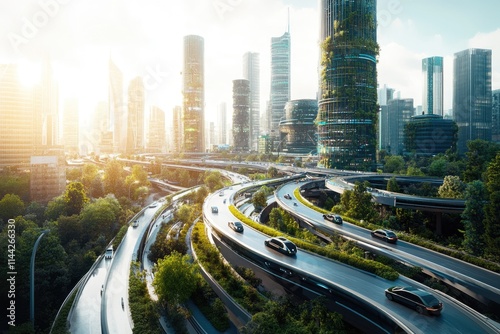 © Thedinindu, Fototapeta premium Futuristic eco-city with elevated highways winding through lush greenery and modern skyscrapers.