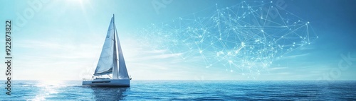 © PUKPIK, Fototapeta premium Futuristic Eco-Friendly Wind-Powered Sailboat with Digital Map Overlays Gliding Across Clear Ocean Waters