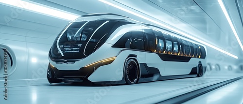 Fototapeta premium Futuristic electric bus driving through a white tunnel.