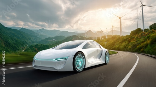 Fototapeta premium futuristic electric car driving on a road with wind turbines