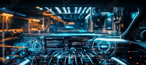 Fototapeta premium Futuristic Electric Vehicle Garage with Holographic Displays and Innovative Control Technology