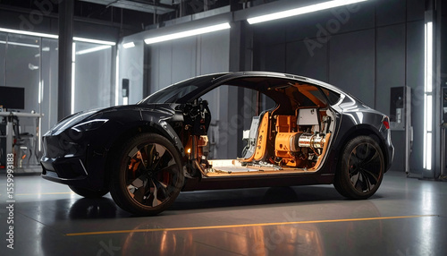 Obraz premium Futuristic electric vehicle with transparent body showing internal systems,...