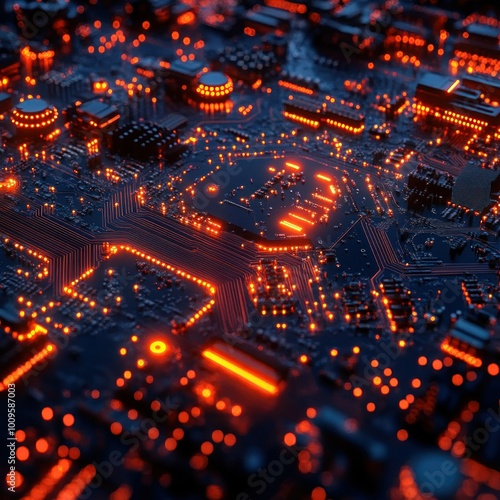 © Tuong, Obraz premium Futuristic Electronic Board for Quantum Computing and AI in Cityscape Design