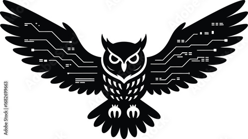 Obraz premium Futuristic electronic owl with circuit board wings silhouette