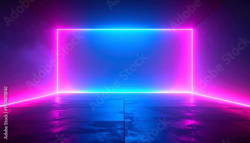 Fototapeta premium Futuristic empty room with a glowing rectangular neon frame casting pink and blue light on a reflective dark floor