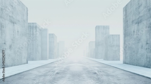 Fototapeta premium Futuristic empty street scene with tall concrete buildings on both sides and...